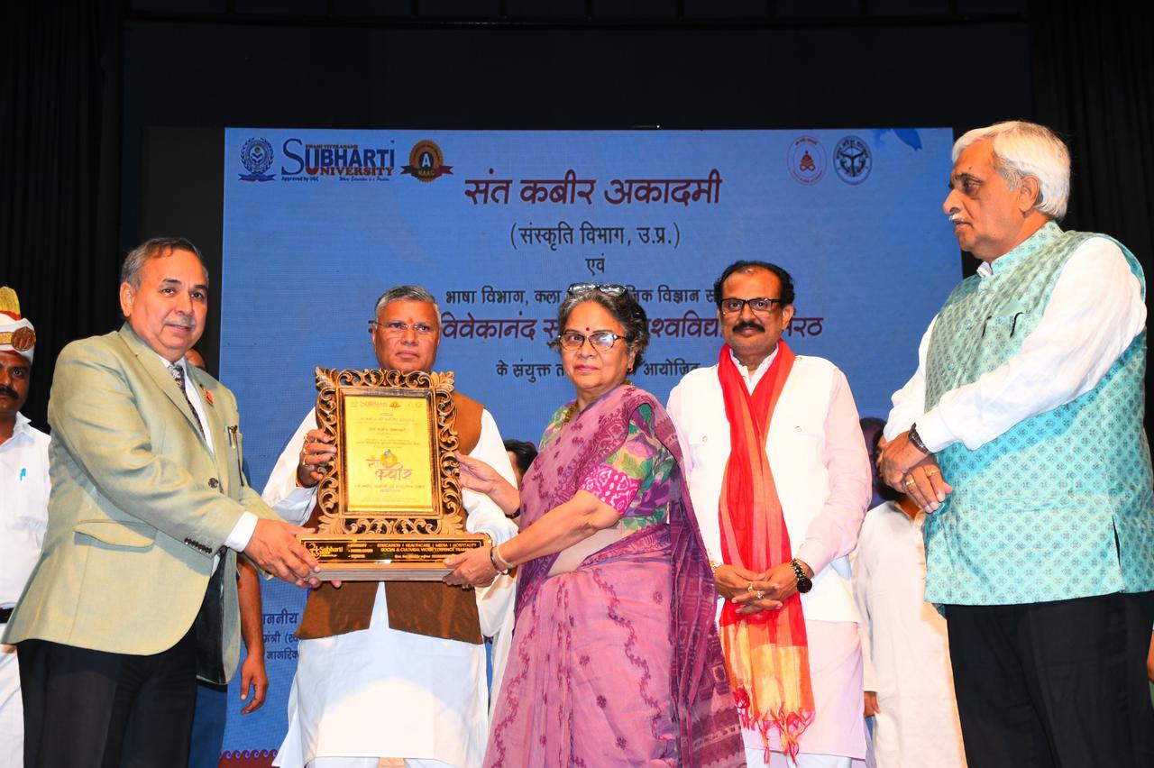 मेरठः स्वामी विवेकानंद सुभारती विश्वविद्यालय मेरठ में भाषा विभाग, कला एवं सामाजिक विज्ञान संकाय, सुभारती विश्वविद्यालय, संत कबीर अकादमी (संस्कृति विभाग, उत्तर प्रदेश) के संयुक्त तत्त्वावधान में रंग कबीरः संगोष्ठी एवं सांस्कृतिक उत्सव का शुभारंभ हुआ। यह आयोजन 11 से 13 सितम्बर 2025 तक तीन दिवसीय स्वामी विवेकानंद सुभारती विश्विद्यालय, सुभारतीपुरम, मेरठ में आयोजित किया जा रहा है। इस कार्यक्रम के उद्धाटन सत्र में उत्तर प्रदेश सरकार के होमगार्ड्स विभाग एवं नागरिक सुरक्षा विभाग के राज्यमंत्री (स्वतंत्र प्रभार)धर्मवीर प्रजापति, श्रम एवं सेवायोजन मंत्री उत्तर प्रदेश डॉ. रघुराज सिंह, संत कबीर अकादमी के निदेशक अतुल द्विवेदी, स्वामी विवेकानंद सुभारती विश्वविद्यालय की कुलाधिपति डॉ. स्तुति नारायण कक्कड़, कुलपति प्रोफे.(डॉ.) पी. के शर्मा के द्वारा पारंपरिक रुप से दीप प्रज्ज्वलन के साथ हुआ।