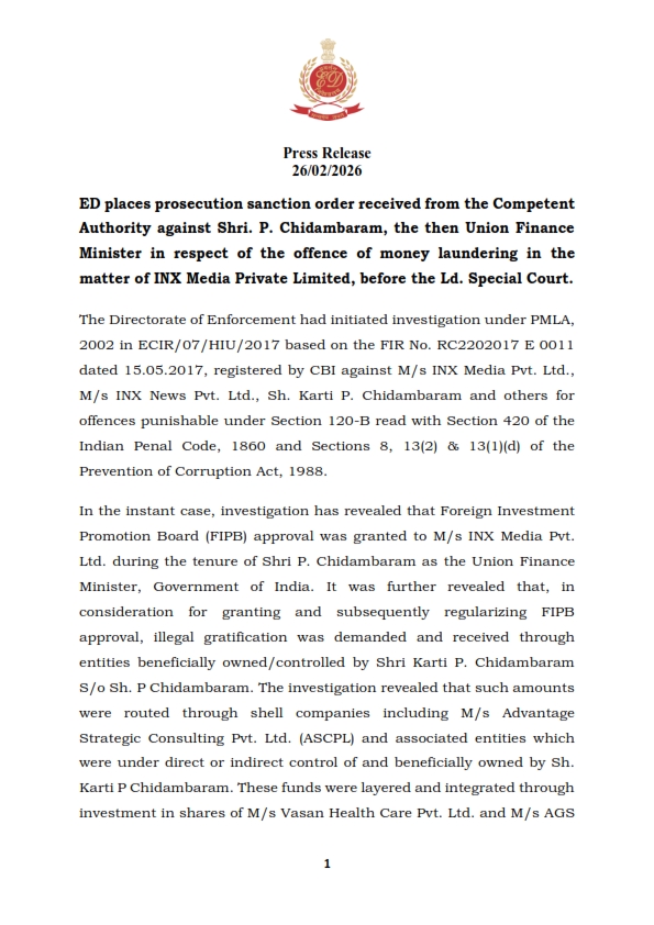 BB ओरिजिनलNews Office पी. चिदंबरम की मुश्किलें बढ़ी..!! February 27, 2026 Satish Kumar दिल्ली: ED ने आईएनएक्स मीडिया मनी लॉन्ड्रिंग मामले में पूर्व केंद्रीय वित्त मंत्री पी. चिदंबरम के खिलाफ सक्षम प्राधिकारी से अभियोजन मंजूरी प्राप्त कर विशेष अदालत में पेश किया। मामले में आगे की कानूनी कार्रवाई की प्रक्रिया शुरू की गयी है।